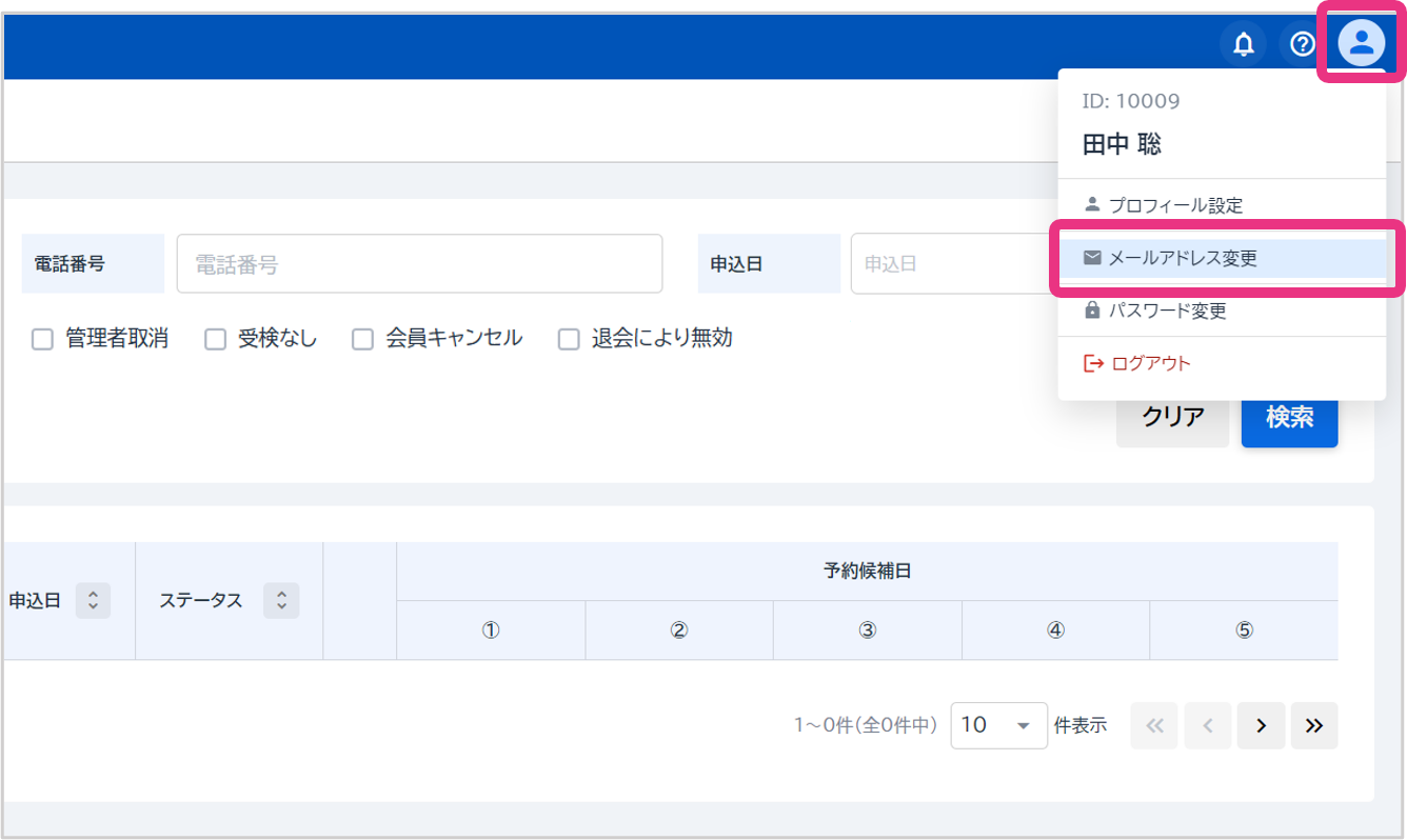 ログイン後、画面右上のアイコンをクリックし、表示されるメニューから「メールアドレス変更」をクリックしてください。