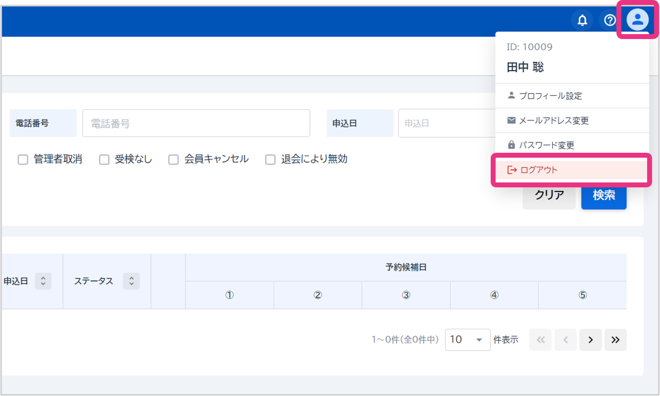 画面右上のアイコンをクリックし、表示されるメニューから「ログアウト」をクリックしてください。